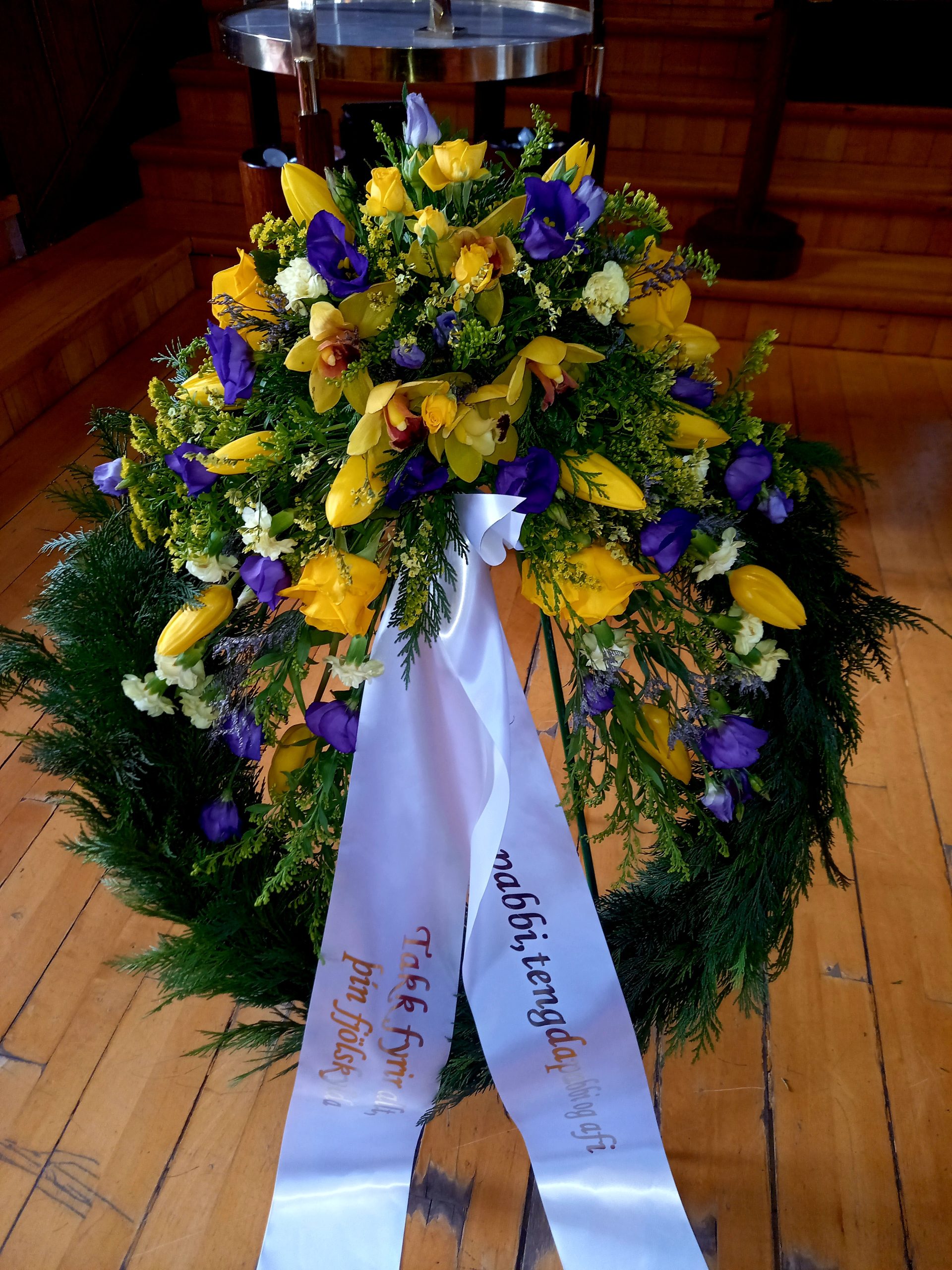 Útfararkrans er hægt að fá í þeim litum er fólk kýs og er myndin dæmi um útfærslu.