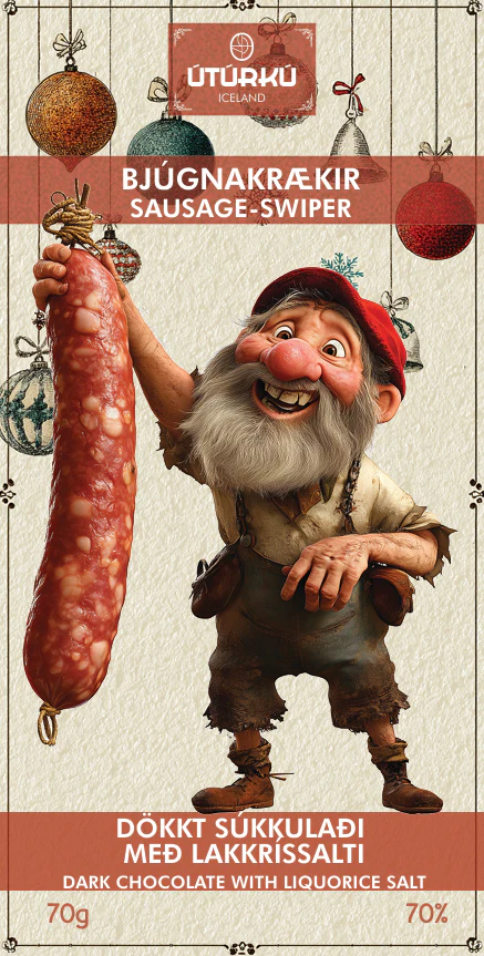 Sausage-Swiper (Bjúgnakrækir) is the ninth of the Icelandic Yule lads and one of the most entertaining of them all. He comes down from the mountains on the night of December 20th. Sausage-Swiper loved sneaking into homes and stealing sausages – especially the smoked or dried kind that were hanging from the ceiling beams. He was said to be ery sneaky and agile, hiding in the rafters or up in the chimney until everyone went to bed. Then, using a hook or long pole, he would reach out and snag the sausages to feast on them.
