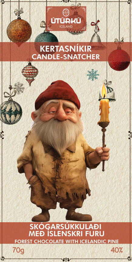 Kertasníkir er þrettándi og síðasti jólasveinninn. Hann kemur niður af fjöllunum að kvöldi 24. desember. Áður fyrr voru kerti á Íslandi gerð úr dýrmætri tólg eða fitu, ekki vaxi – þau voru bæði verðmæt og æt. Fyrir svangt tröllabarn eins og Kertasníki voru kerti sannkölluð veisla! Kertasníkir elti börn og betlaði um kerti, eða laumaðist inn í hús til að stela þeim þegar enginn sá til. Hann elskaði birtuna, en enn meira bragðið – hann borðaði tólgarkertin eins og sælgæti. Súkkulaðið: 70 g Mjög einstakt súkkulaði sem færir jólin til skilningarvitanna. 40% mjólkursúkkulaði með furuolíu, tínt úr skógum í Borgarfirði á Vesturlandi. Furunálarnar eru eimaðar og olían sem myndast er notuð til að bragðbæta súkkulaðið. Furan gefur sterkt bragð sem minnir á myntu og sítrusávexti og lyktin er eins og af jólatré. Súkkulaðið er búið til úr baunum frá Suður-Ameríku.
