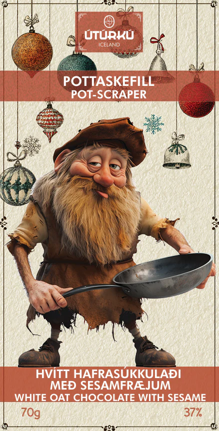 Pottaskefill er fimmti jólasveinninn. Hann kemur niður af fjöllunum aðfaranótt 16. desember. Pottaskefill er lævís eldhússnillingur sem læðist inn í hús seint á kvöldin og leitar að pottum sem eru skildir eftir án eftirlits eða óþvegnir. Hann er þolinmóður – bíður þangað til fjölskyldan fer að sofa – og þá sleikir hann og skafar alla matarbita sem festast við hliðarnar. Súkkulaðið: 70 g 37% vegan hafrasúkkulaði með svörtum sesamfræjum. Súkkulaðið er búið til úr baunum frá Suður-Ameríku.